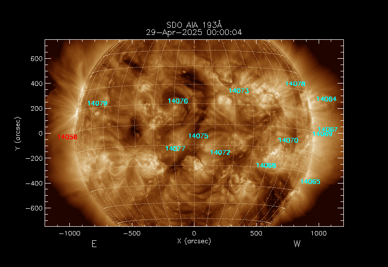 Click on an Active Region plot to display the Region Report including the region evolution and flaring history. HEC Search for NOAA Active Regions (SRS) records for this date and the day before.