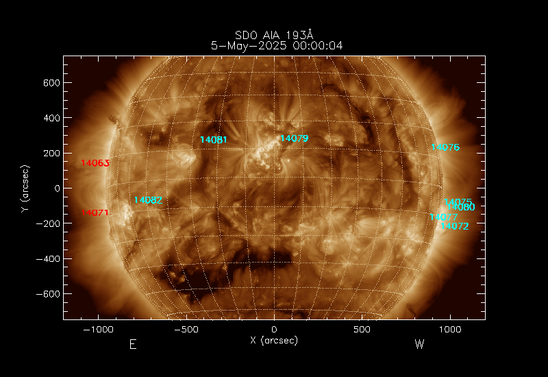Click on an Active Region plot to display the Region Report including the region evolution and flaring history. HEC Search for NOAA Active Regions (SRS) records for this date and the day before.