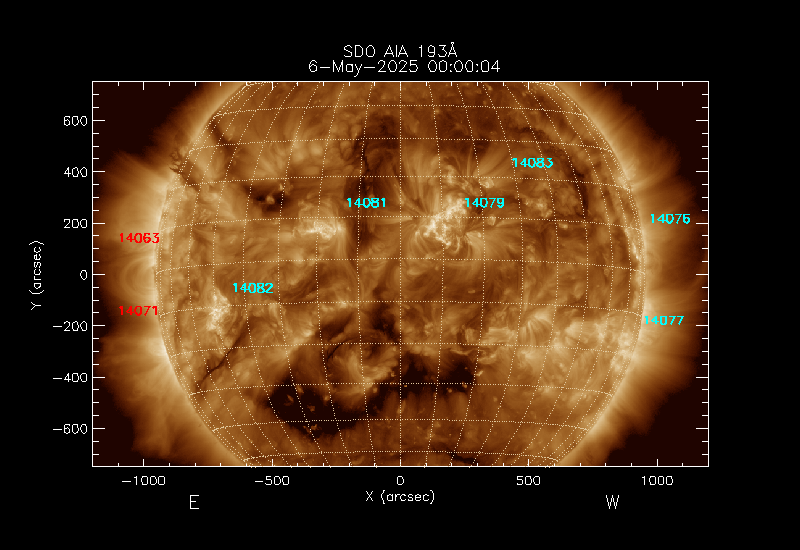 Click on an Active Region plot to display the Region Report including the region evolution and flaring history. HEC Search for NOAA Active Regions (SRS) records for this date and the day before.