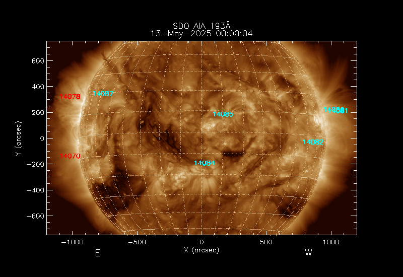 Click on an Active Region plot to display the Region Report including the region evolution and flaring history. HEC Search for NOAA Active Regions (SRS) records for this date and the day before.