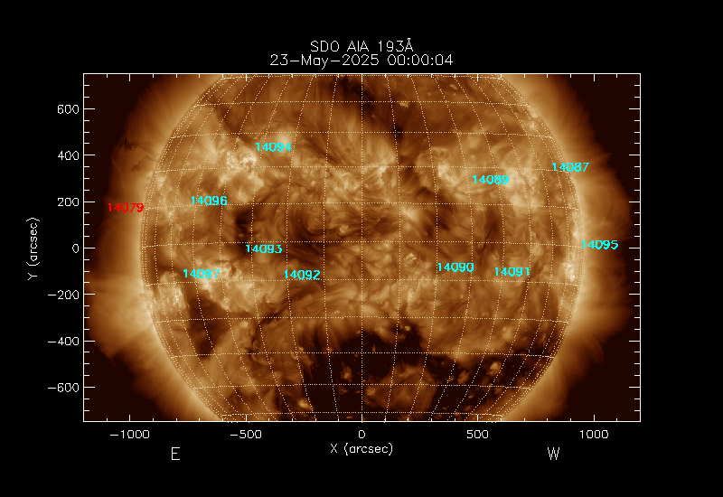 Click on an Active Region plot to display the Region Report including the region evolution and flaring history. HEC Search for NOAA Active Regions (SRS) records for this date and the day before.
