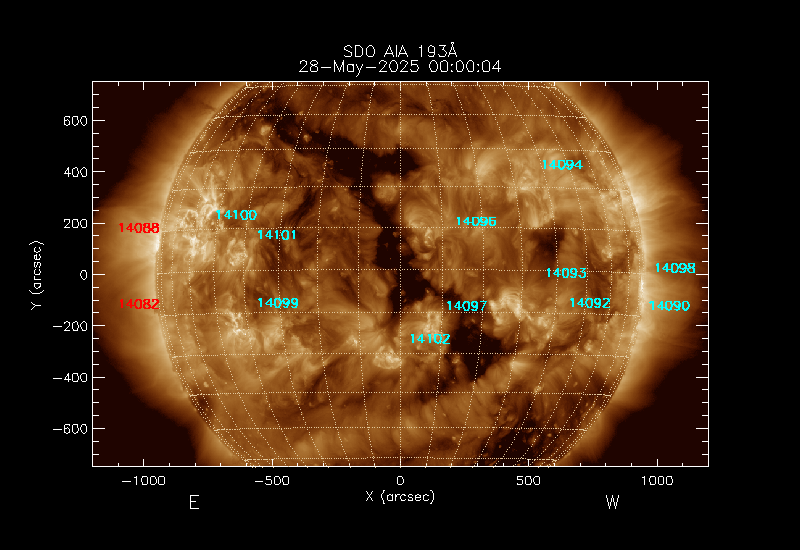 Click on an Active Region plot to display the Region Report including the region evolution and flaring history. HEC Search for NOAA Active Regions (SRS) records for this date and the day before.