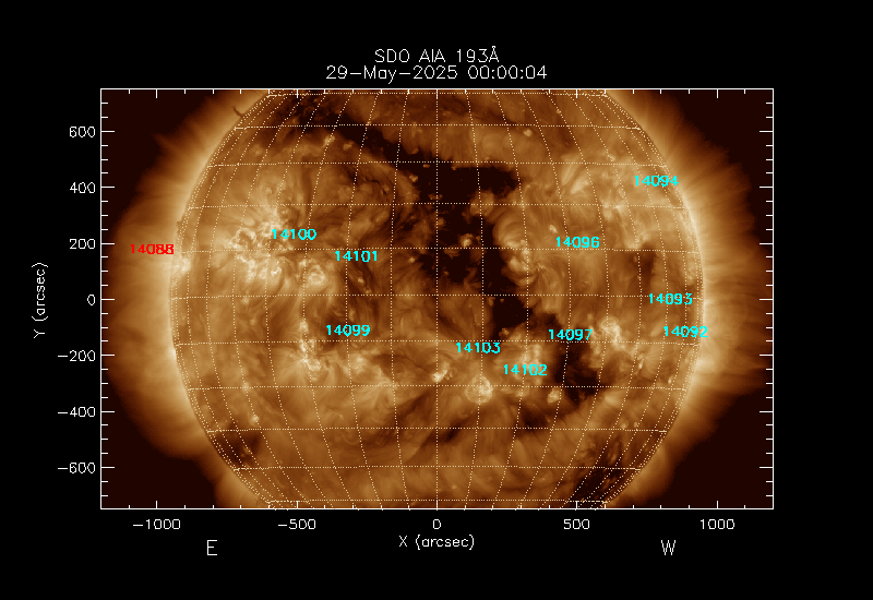 Click on an Active Region plot to display the Region Report including the region evolution and flaring history. HEC Search for NOAA Active Regions (SRS) records for this date and the day before.