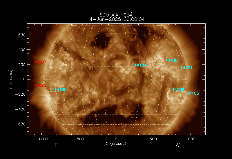 Click on an Active Region plot to display the Region Report including the region evolution and flaring history. HEC Search for NOAA Active Regions (SRS) records for this date and the day before.