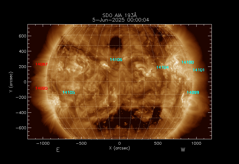 Click on an Active Region plot to display the Region Report including the region evolution and flaring history. HEC Search for NOAA Active Regions (SRS) records for this date and the day before.