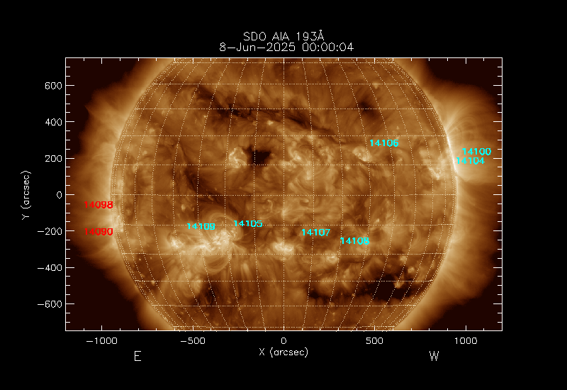Click on an Active Region plot to display the Region Report including the region evolution and flaring history. HEC Search for NOAA Active Regions (SRS) records for this date and the day before.