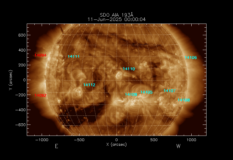 Click on an Active Region plot to display the Region Report including the region evolution and flaring history. HEC Search for NOAA Active Regions (SRS) records for this date and the day before.