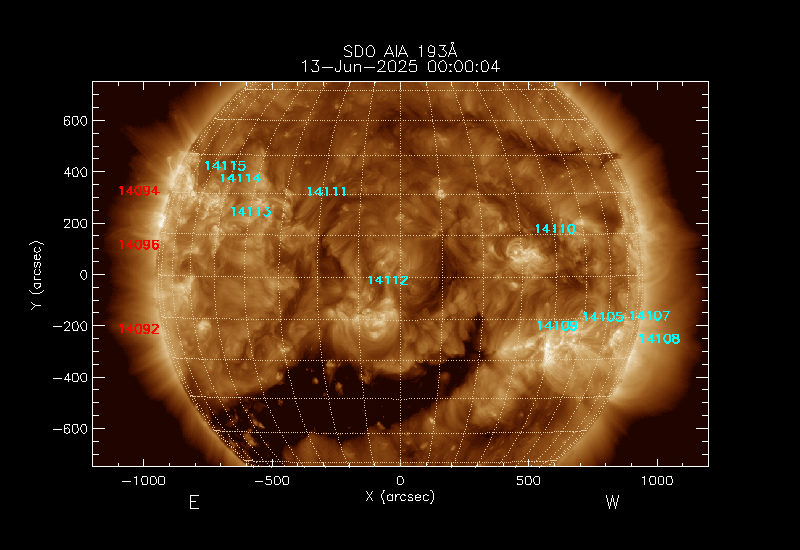Click on an Active Region plot to display the Region Report including the region evolution and flaring history. HEC Search for NOAA Active Regions (SRS) records for this date and the day before.