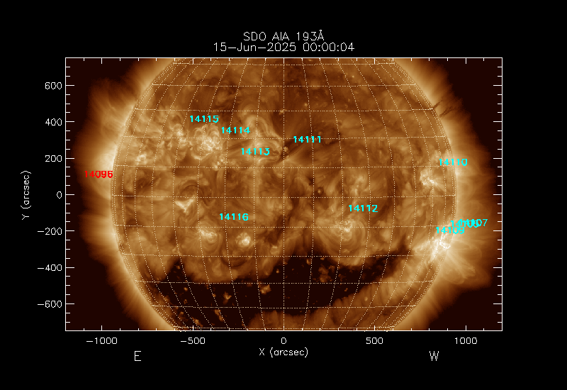 Click on an Active Region plot to display the Region Report including the region evolution and flaring history. HEC Search for NOAA Active Regions (SRS) records for this date and the day before.
